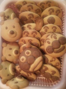 残念ながら、色の濃いい部分は「ココア」の生地で作ってたのだが、「アン〇ンマン」の顔で使いすぎてしまい、「バ〇キンマン」は1個しか出来なかったw