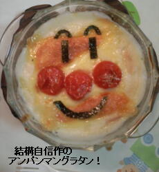 どうでしょうか?!丸い耐熱皿に、グラタンの生地を流し込んだ後、チーズを一枚のせて~プチトマトの輪切りで「アンパンマン」の鼻とほっぺを♪