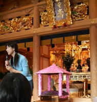 ←小さい家みたいなのに立っている「お釈迦様」の仏像に、花を供えて甘茶(お茶)をかけていくのだ。