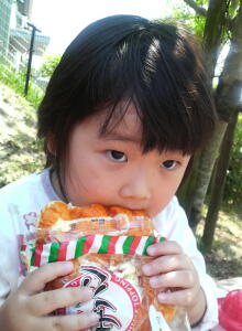 スーパーで買った半額のパンを、ベンチに座って2人で食べたよ。