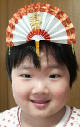 市販の鏡餅を飾っていたのだが、その鏡餅のオプションで付いていた「田吾作(飾りの扇のやつね)」を、ふざけて私はジュニアのおでこに付けてやった!