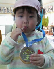 室内を駆ける「かけっこ」や「体操」「玉入れ」やらあり、後半では「アメ取り競争」が始まる~!