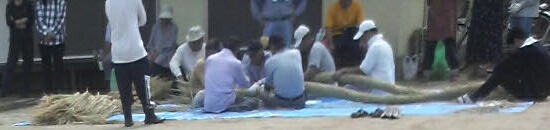 皆さんで「わら」を結っていき、少しずつ「鳥居」に飾ってある「しめ縄」の姿へなっていくのであった!!!