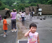 左の三角の茅葺屋根が「湯の花」を作ってる小屋で、右の三角茅葺屋根が「家族風呂」である。