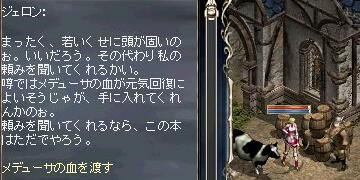 その後も面倒で・・・オヤジに話しかけたら、今度は健康のために「呪われたメデューサの血」を持ってこいと。