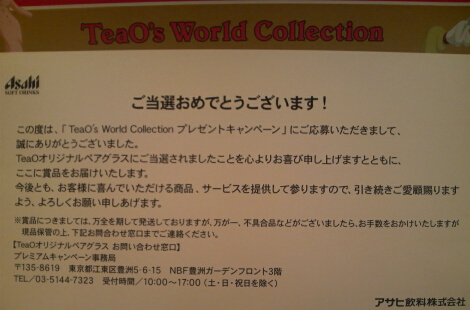まあくじ運には全くと言っていいほど縁がない私だが、先日の「リプトン」の「ペアグラス」があったのを皮切にか?どうかは謎だが・・・。