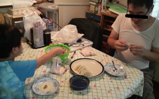 大人の私と旦那はそれなりに餃子の形になってはいたが・・・ジュニアにはまだ早かったのか、具を乗せるまではいいが・・・餃子のヒダを作る事ができずに半分に折るだけw