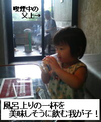 しかしジュニアが気になるので、早めに温泉から出て、私は自販機前で待機!