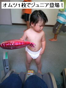 オムツ1枚でジュニア登場!しかもお土産のイルカを握ったままの姿で!