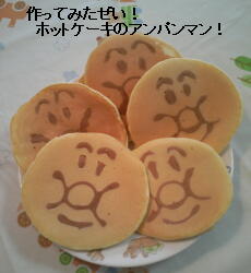 フライパンにアンパンマンの顔を先に書いて(ココアを入れた生地で書く)その顔の線の上にホットケーキの生地を流し入れる。