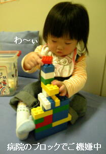 部屋にブロックが置いてあって、ジュニアはそれで遊んでご満悦だった。