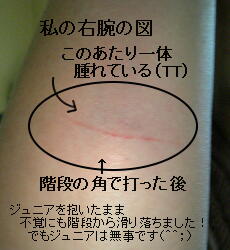 でも落ちる瞬間!私はジュニアを落とすまいと、とっさに右肩から落ちたのでジュニアは無事でした!