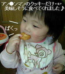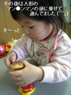 そして食べ飽きると、フリカケの容器のアン●ンマンの上に、クッキーを置いて遊んでました。