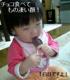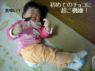 んで、昼間にグズルから、まだ食べさせるには早いと思って隠しておいた「ペロリンチョコのアンパンマン」をあげてみた!おやつにチョコの塊を上げるのはまだ早いと思っていたが・・・あげるとこの上なく喜んで食べてくれた!
