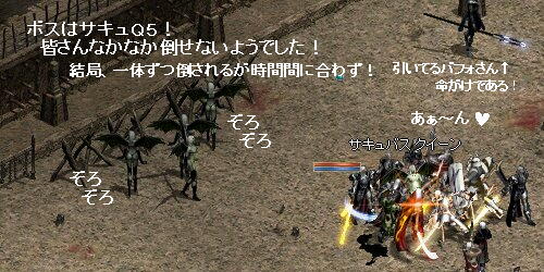 んで、今日のボスはサキュ5だったがHPが多いのかなかなか倒せない!最後あと1匹と言う所で時間切れ!皆さん頑張られました~!