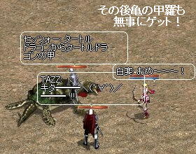 まず近場でSKT近辺のKB倒すことになり、TAZZさんは生餌♪割と早く「契約書」とかでたよ!次は「取引文書」でこれもまたすぐ出て、勢いでアデン→のリザスポットで「亀の甲羅」3匹目ぐらいでゲット~!