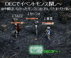 で、夜~!遼太さんナイトとTAZZさんとでDECに手紙を取りにGO!しかしDECはどこも人ばかりでモンスがいませ~ん!しかたがないのでDEC3F爆走で広場に行こうとしたら、朝には出なかったDEモンスが出てビックリ(><)主にTAZZさんに頑張っていただいて難をしのげました~!