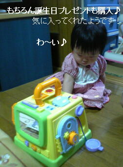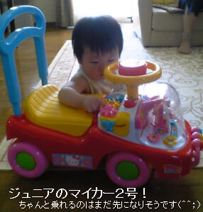 午前中は家の事を済ませて、ジュニアを朝寝させて~。10時半に母上がプレゼントをもってやってきた!プレゼントは幼児が乗れる「キティちゃんの押し車」乗れるし押して歩けるが、まだ怖いのか乗せると抵抗する(^^;)興味があるのは、座席の下の収納スペース・・・。開けたり締めたりを繰り返していた。
