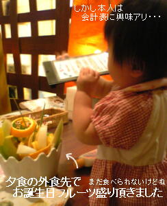 一通り食事も済ませ、さあ帰ろうかと準備してたら、帰り間際にジュニアの一歳の誕生日と言う事で「フルーツ盛り合わせ」を店員さんが持ってきてくれた!なんて気が利くお店でしょう(><)